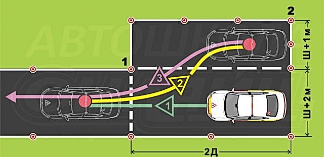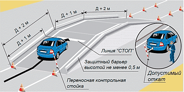 - После остановки фиксируем автомобиль с помощью ручного тормоза. Педаль тормоза отпускаем. В этот Pin-Up сзади автомобиля (на расстоянии 30 см) устанавливают дополнительный конус 1 с планкой.
