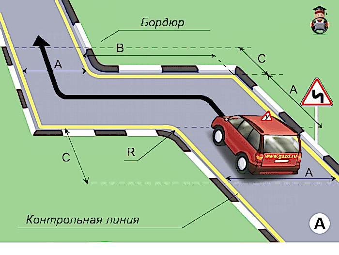- Подъезжаем к линии начала упражнения и останавливаемся. При этом подъехать к линии нужно таким Pin-Up чтобы автомобиль оказался как можно ближе к правому краю коридора. Это упростит выполнение упражнения в дальнейше