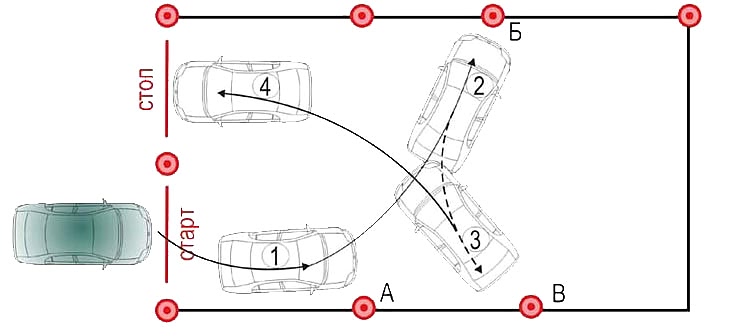 - Останавливаемся. Выкручиваем руль до конца в правую сторону. 8.Начинаем движение и подъезжаем к линии завершения упражнения. При этом не имеет значения под каким Pin-Up подъехать к данной линии